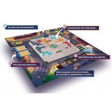Ouvrez des restaurants, construisez des terrasses, réalisez des objectifs, remportez des majorités pour gagner le plus de points de victoire et remporter la partie !