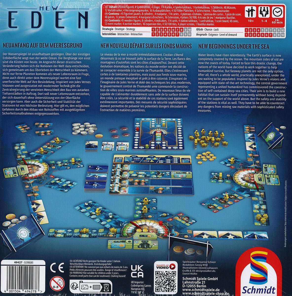 Dans ce nouveau jeu de Benjamin Schwer (l'auteur d'Hadara), les joueurs contribueront à la construction de New Eden, une cité sous-marine dernier espoir de l'humanité après l'apocalypse qu'a connu la Terre. Même si le développement de la cité est au coeur de vos préoccupations, vous devrez constamment veiller à ne pas endommager la station. Si vous êtes trop gourmands avec les ressources naturelles de la Cité, vous risquez de voir vos rêves de grandeur s'effondrer.