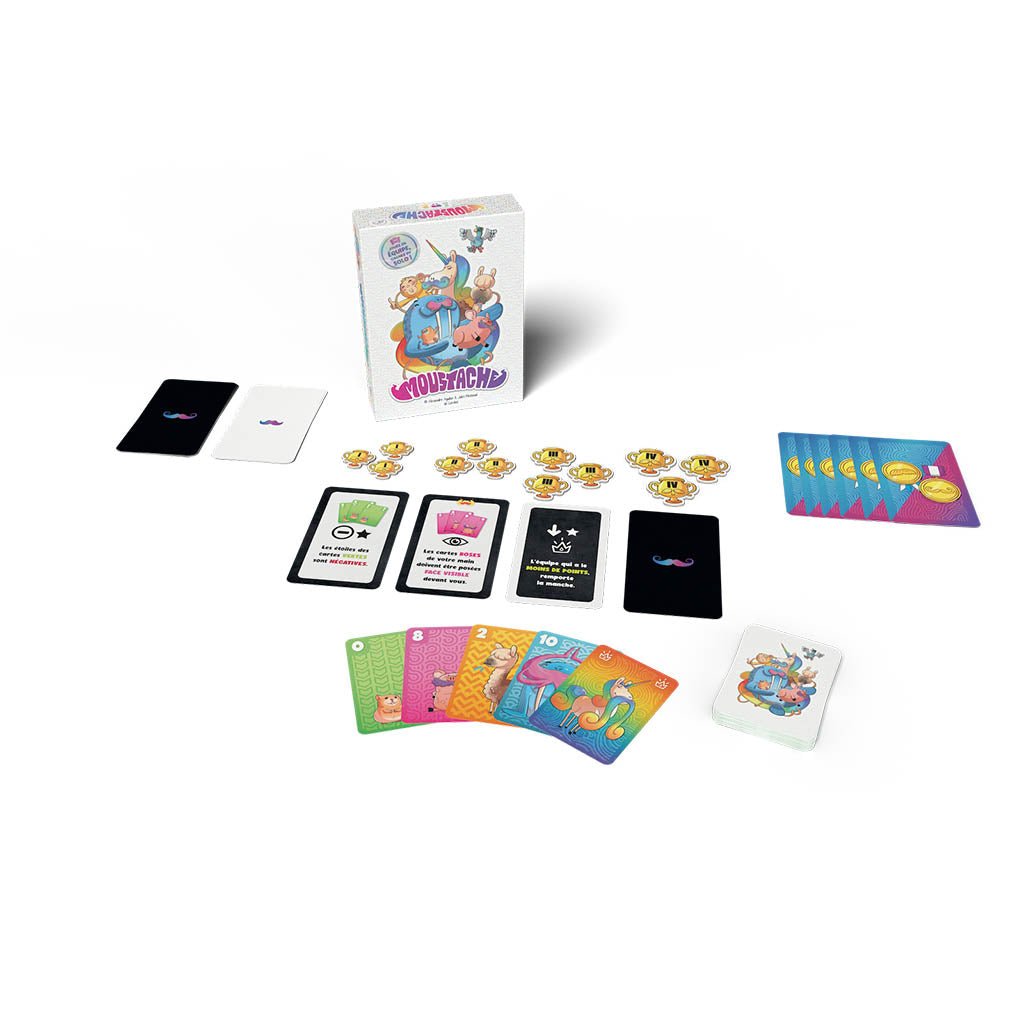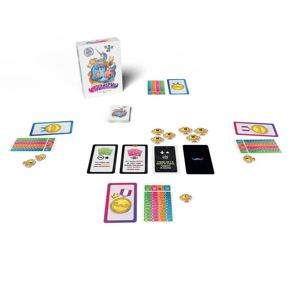 Avec Moustache, découvrez un jeu de plis revisité où rien n’est jamais acquis. À chaque manche, les équipes changent aléatoirement et une nouvelle règle bouleverse la partie : inversion des couleurs, jokers farfelus, effets imprévisibles… Impossible de se reposer sur ses acquis, il faut s’adapter sans cesse !