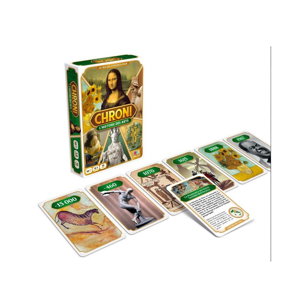 Chroni - Histoire des Arts est un jeu de société captivant et éducatif, spécialement conçu pour enrichir et mettre à l'épreuve la culture générale des joueurs dans le vaste domaine de l'art. Ce jeu unique en son genre invite les participants à un voyage fascinant à travers l'histoire de l'art, depuis les origines de la créativité humaine jusqu'à l'art contemporain. Avec une collection méticuleusement sélectionnée de 80 œuvres d'art emblématiques, le jeu offre une exploration diversifiée et enrichissante. Parmi ces œuvres, on trouve des trésors tels que la Vénus de Willendorf, un artefact préhistorique datant d'environ -23 000 ans, et des créations d'artistes modernes et provocateurs comme Banksy.