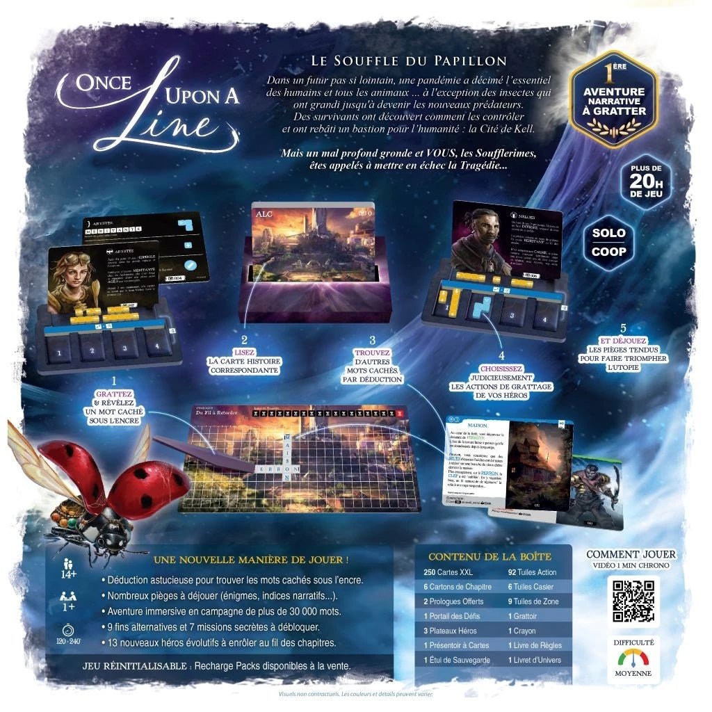 Once Upon A Line : Le Souffle du Papillon est un jeu narratif unique au monde, mêlant aventure, déduction et… cartes à gratter ! En solo ou en coopération, incarnez les Soufflerimes, des entités anciennes chargées de préserver l’équilibre des univers. Votre mission : guider des héros à travers une saga épique où chaque choix — et chaque zone que vous grattez — influence réellement le cours de l’histoire.