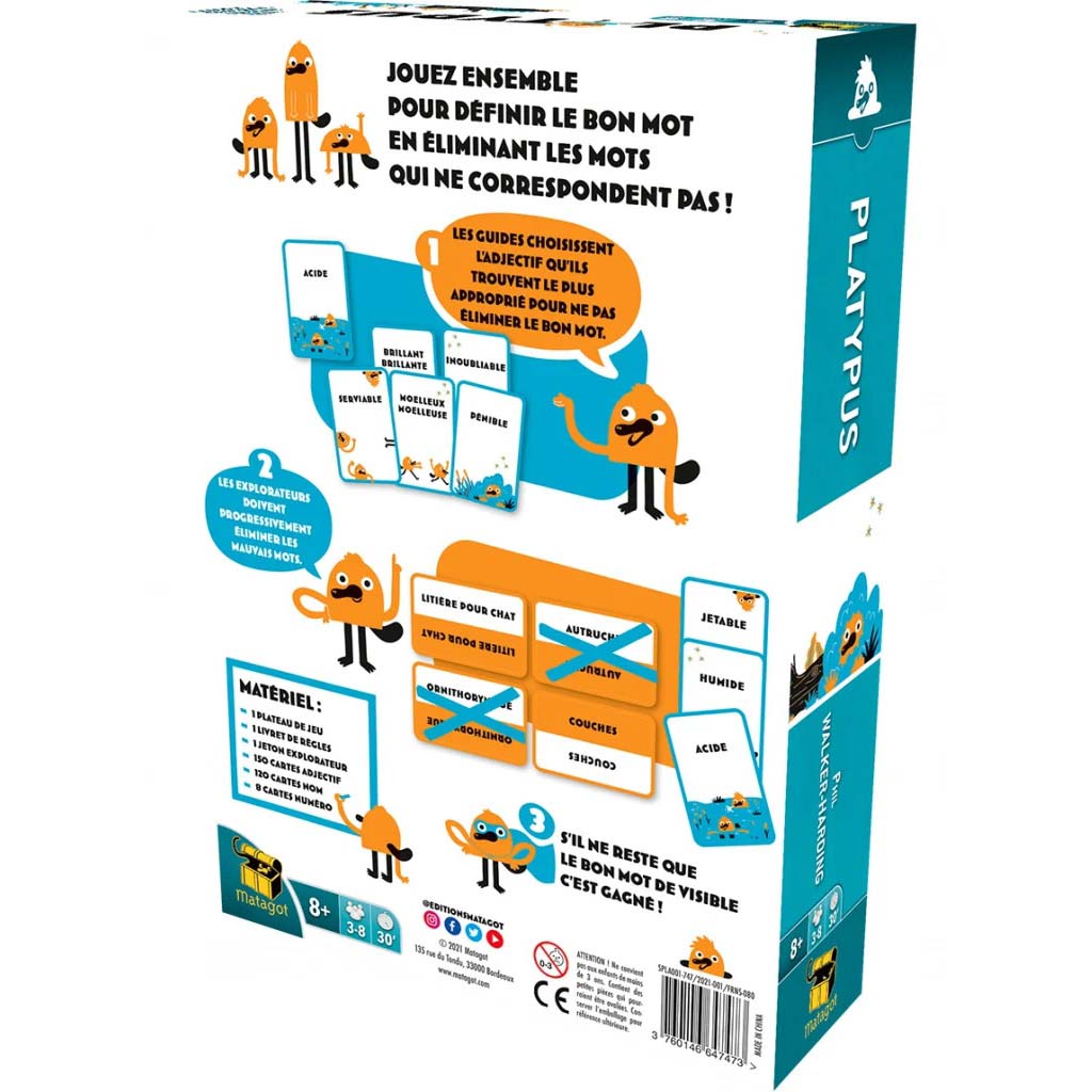 Acide ? Dangereuse ? Énervante ? Une vendeuse de voitures ! Comestible ? Rapide ? Souple ? Captain America ou une autruche ? Dans Platypus, les joueurs coopèrent pour éliminer progressivement les mauvais mots, afin de trouver et d'identifier le Platypus grâce à leurs cartes Adjectif. Entre définitions très personnelles et cartes en main limitées, il faudra parfois avoir de l’intuition et même de l’imagination !