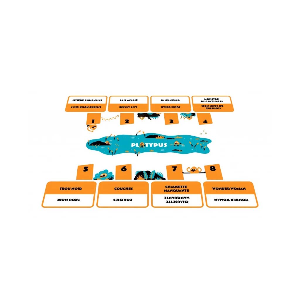 8 noms communs ou propres – les cartes Platypus – sont disposées face visible devant l’ensemble des joueurs. Les Guides connaissent la carte à faire deviner aux Explorateurs.