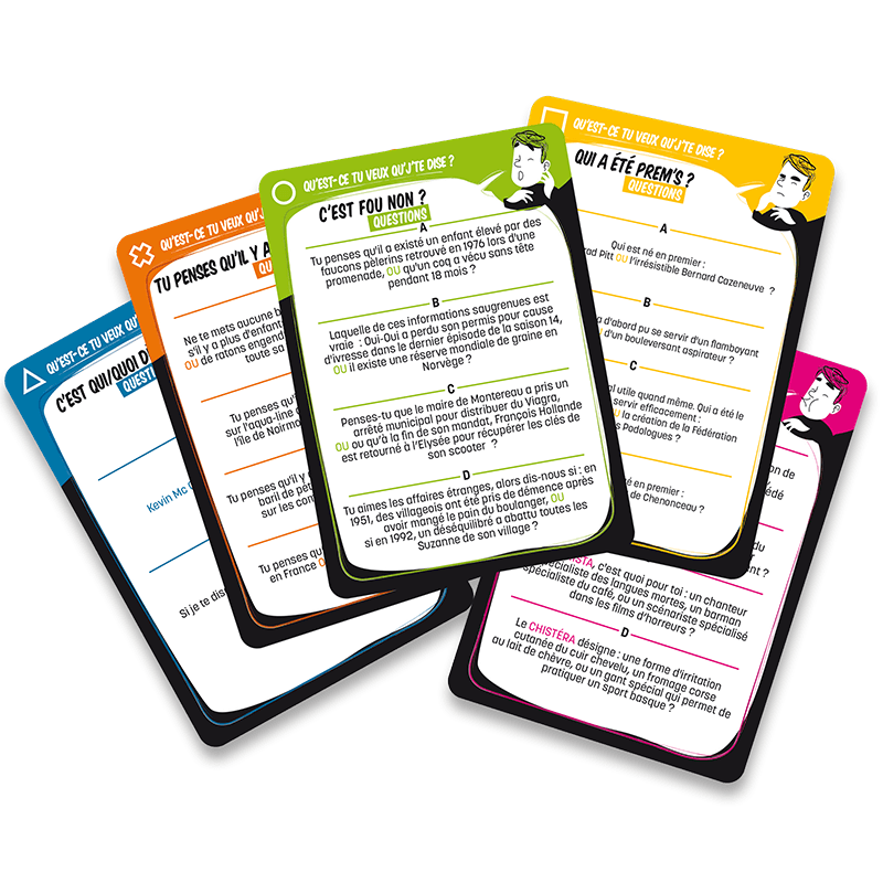 Pas de plateau, pas de figurines, pas de règles complexes : Qu’est-ce tu veux qu’j’te dise ?! est un jeu d’ambiance de questions/réponses avec 1 000 questions réparties en 5 thèmes mélangeant culture, insolite et absurde.