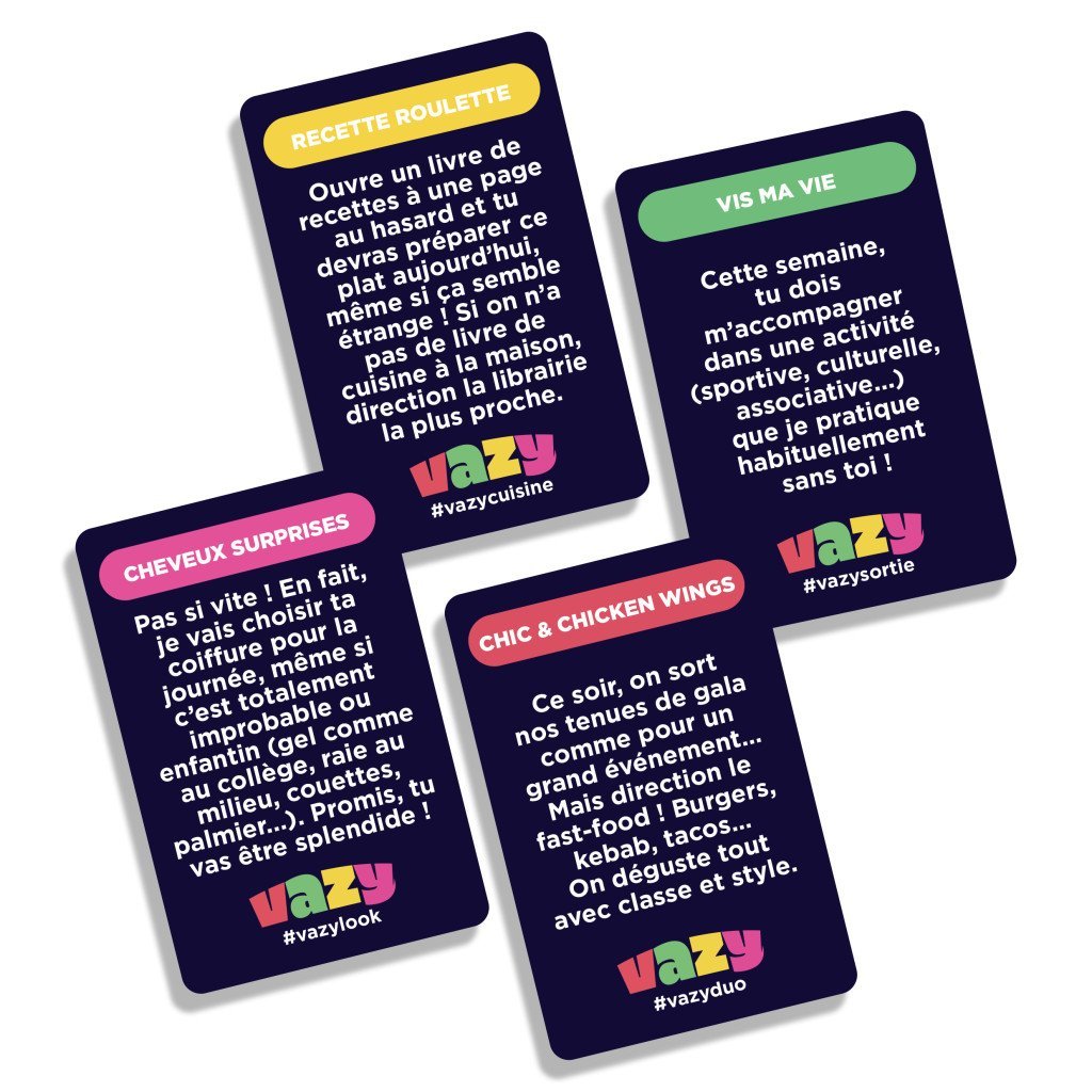 Dans Vazy, chaque joueur commence avec 30 cartes défi qu'il peut utiliser à tout moment. Les cartes sont variées, allant des défis classiques à ceux à réaliser discrètement, et même des cartes personnalisables pour laisser libre cours à votre imagination. Fixez un délai de jeu de 1 à 4 mois et préparez-vous à des instants hilarants tout au long de l’aventure.