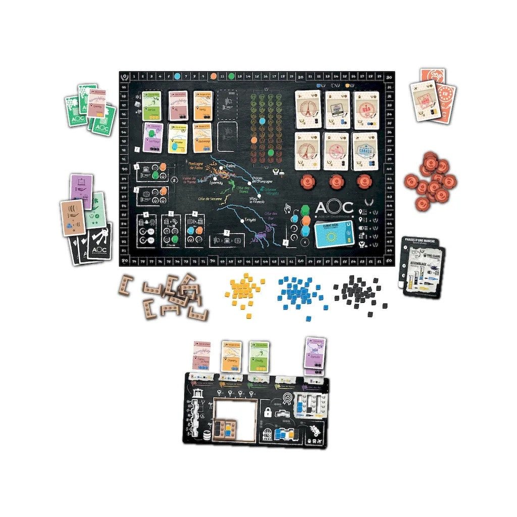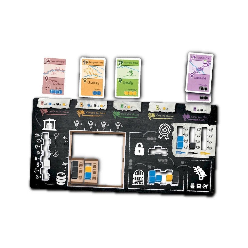 Age of Champagne est un jeu de stratégie très thématique sur la fabrication du Champagne, mêlant les mécaniques de pose d’ouvriers, gestion de ressources et collection de cartes. Au fil de la partie, vous devrez réaliser des investissements judicieux, optimiser la transformation de vos précieux raisins pour répondre aux demandes des différents marchés. Trois collaborateurs polyvalents n’attendent que vos directives pour vous épauler dans votre stratégie.