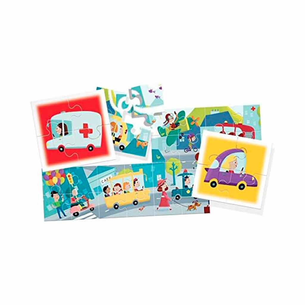D'un côté, les enfants assemblent huit puzzles représentant différents moyens de transport. De l'autre, ils peuvent créer une grande scène urbaine animée.
