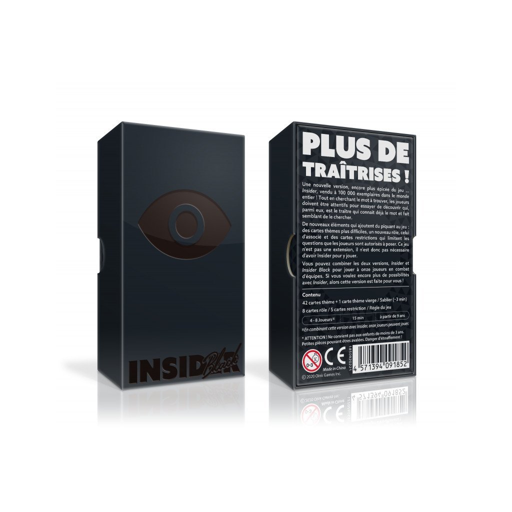 Insider Black rajoute une nouvelle dimension au populaire jeu Insider, en introduisant des éléments de déduction et de bluff. Idéal pour les joueurs qui aiment les intrigues et les stratégies.