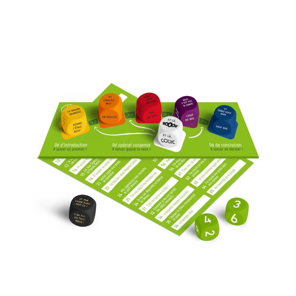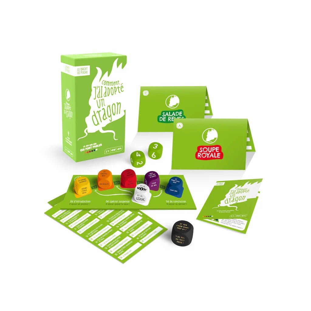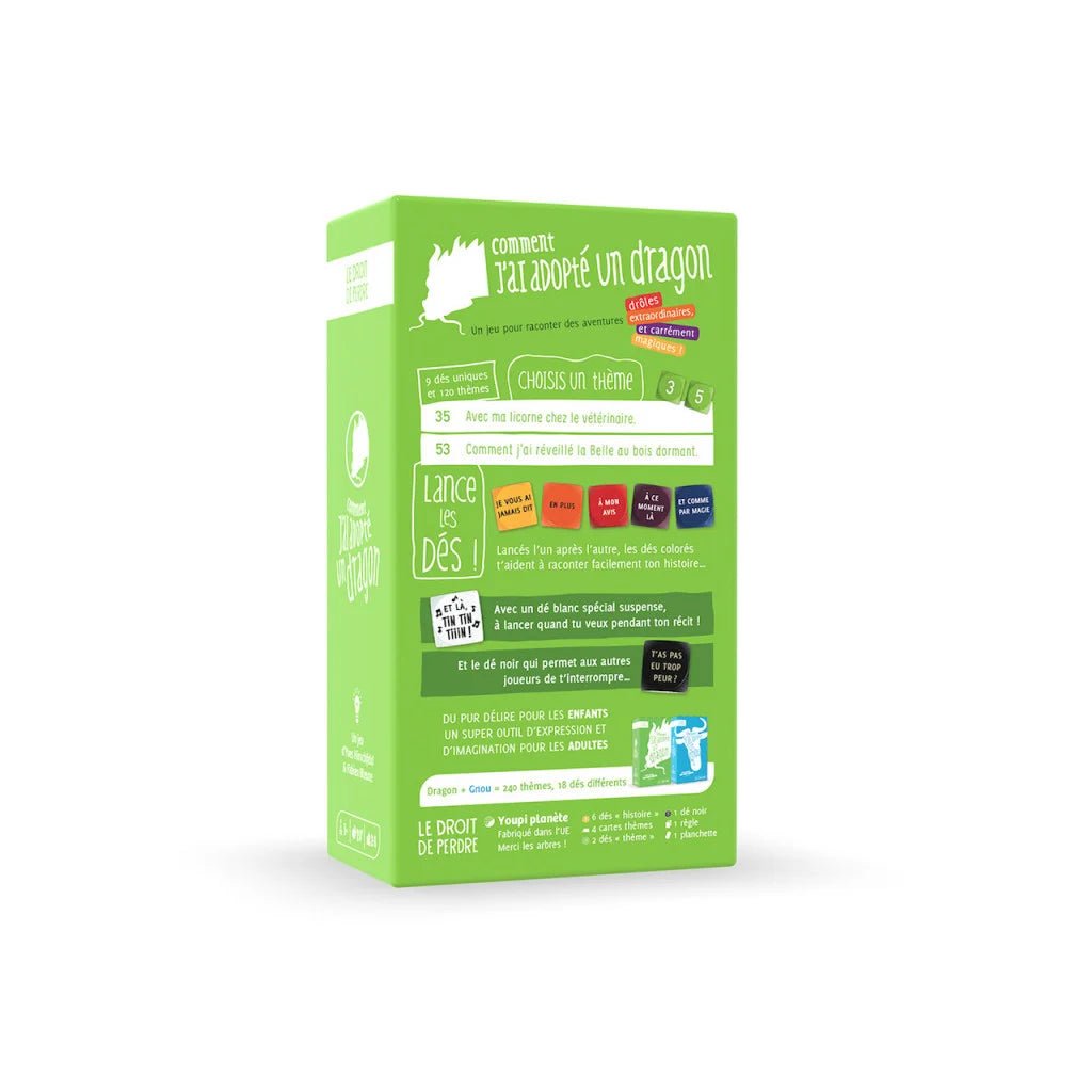 Avec Comment j'ai adopté un dragon, vos langues vont prendre feu ! Explorez 120 nouveaux thèmes dans l'esprit heroic fantasy et 7 nouveaux dés-connecteurs pour raconter vos aventures trépidantes et riches en rebondissements. Avec un dé noir pour interrompre le narrateur et un nouveau dé blanc pour ajouter des bruitages ! Mariez le Gnou et le Dragon pour multiplier les thèmes et allonger vos histoires avec 14 dés !