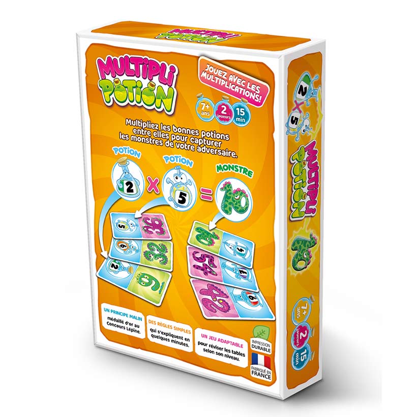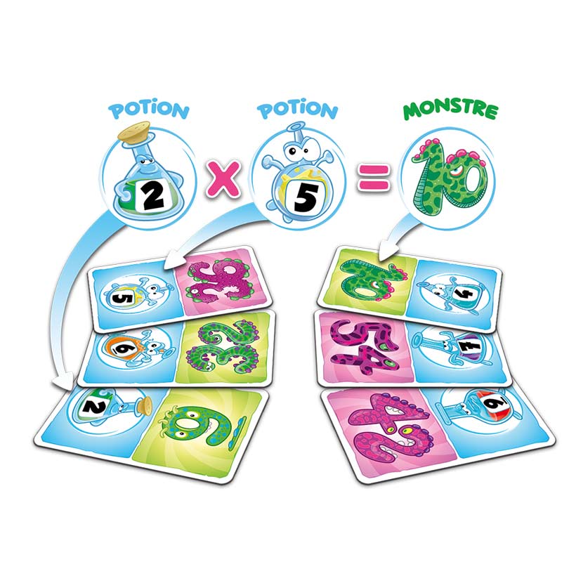 Dans Multipli Potion, vous incarnez un magicien dont le but est d'être le premier à capturer 5 monstres adverses. Pour, multipliez les nombres inscrits sur vos potions magiques pour obtenir le résultat correspondant à la valeur d'un monstre ennemi. Mais soyez vigilant ... ne ratez pas une occasion d'attraper un monstre de votre adversaire et prenez garde à ne pas vous faire capturer trop facilement les vôtres.
