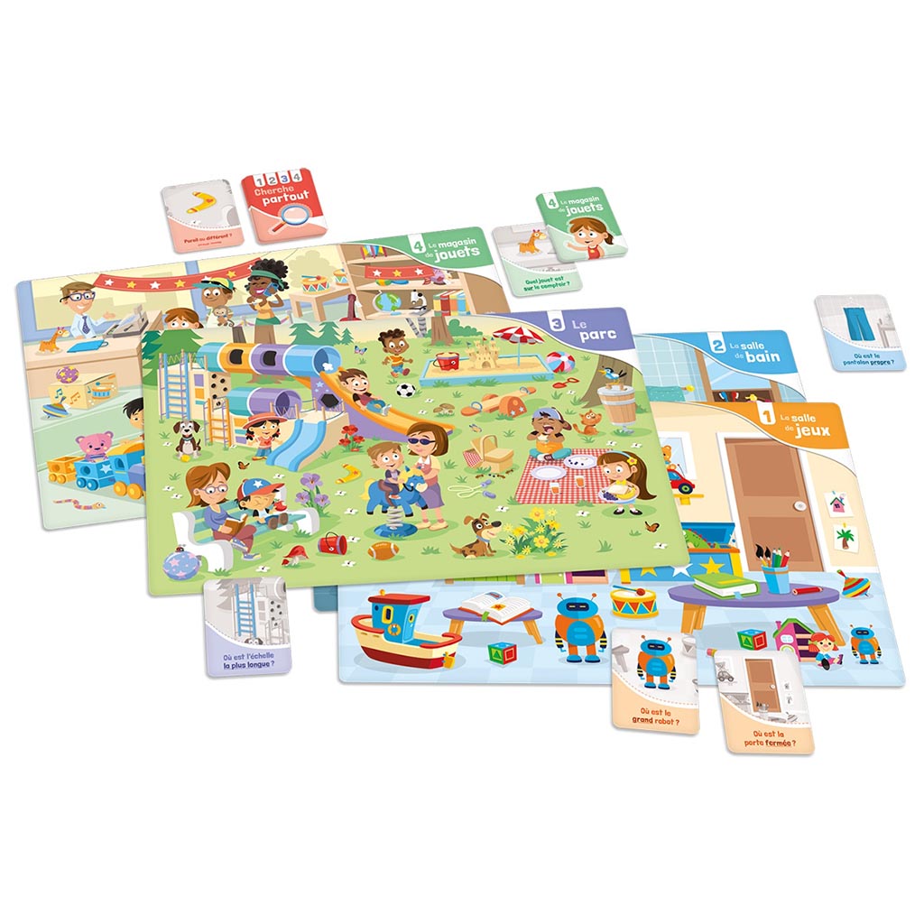 À vos marques, prêts, cherchez! Où est le gros ourson? Qui est à côté de la maison de poupée? Que vois-tu devant le coffre? Pour savoir quel objet ou quel personnage chercher, écoute attentivement la question de papa ou maman.
