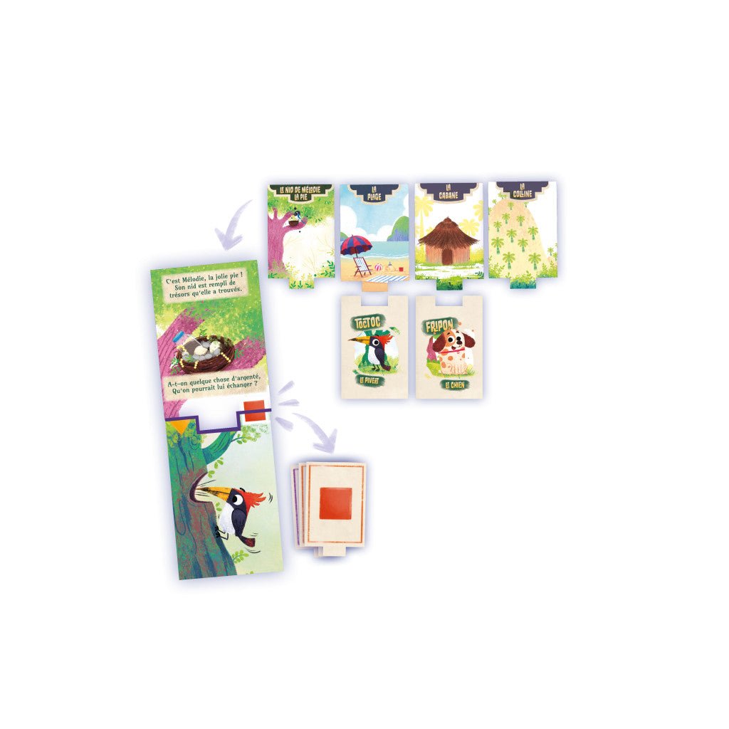 Chaque boîte contient 4 histoires dans lesquelles l’enfant choisit un lieu à visiter. À chaque étape, il observe une scène illustrée et sélectionne deux cartes parmi plusieurs propositions. Si l’association est logique, elle débloque la suite de l’histoire. Sinon… il faudra réessayer. Le parent lit, commente, mime, improvise : c’est une narration à deux têtes, pleine de rebondissements et de dialogues improvisés.