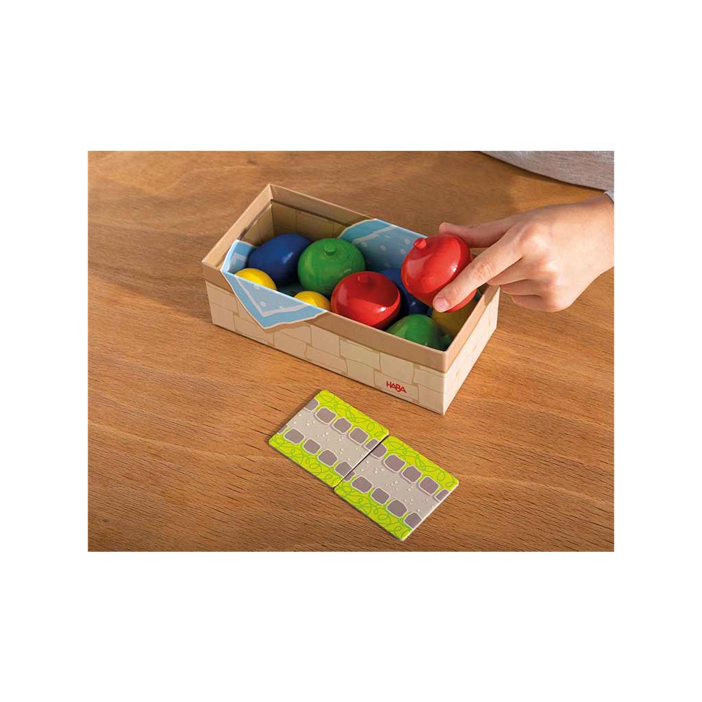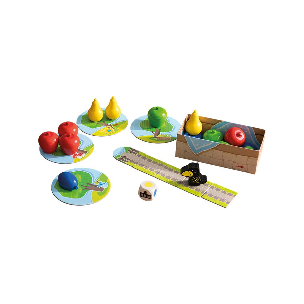 Les arbres croulent sous les fruits et le corbeau Théo aimerait tous les dérober. Lancez le dé et prenez le fruit désigné avant de le glisser dans votre panier. Si le dé indique un corbeau, Théo avance sur sa piste ! Cueillez tous les fruits avant que le cordeau n’arrive dans le verger. Sinon, tout le monde perd la partie.