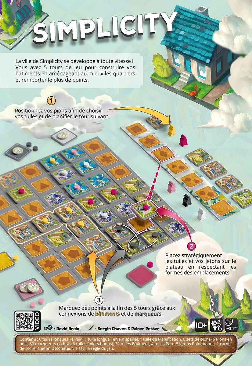 Vous avez 5 tours pour construire la ville parfaite et marquer le plus de points ! Choisissez la tuile qui vous convient et déterminez ainsi l’ordre de jeu du tour. À vous de la positionner au mieux en respectant les contraintes de placements, afin de construire les meilleurs quartiers et de créer le plus de liens entre vos jetons, et devenir ainsi le meilleur urbaniste de Simplicity !