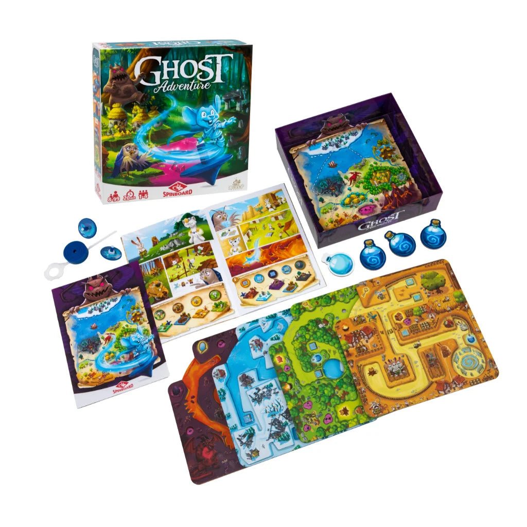 Ghost Adventure est un jeu coopératif qui se joue debout, autour d’une table sans chaise. Les joueurs se relaient pour réaliser ensemble des missions. Chaque mission représente un parcours différent qu’ils vont devoir effectuer avec une toupie à travers plusieurs plateaux. Ils représentent 8 Mondes et de nombreuses cibles à atteindre.