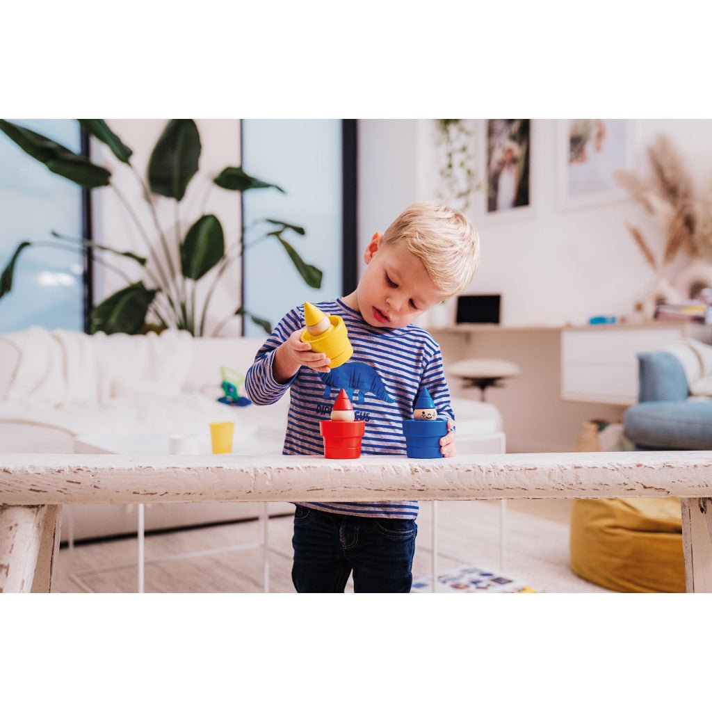 Avec Lut’un, Deux, Trois !, les enfants observent, empilent, cachent et déplacent les pièces en bois pour résoudre 48 défis de logique et d’observation.