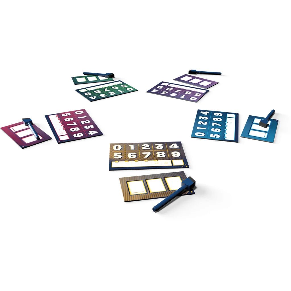 À chaque tour, tous les joueurs écrivent secrètement un nombre de 000 à 999 sur leur tablette, en utilisant les chiffres de 0 à 9, puis ils sont révélés tous en même temps. Écrire un grand nombre rapporte plus de points, mais c’est aussi un pari risqué… car si vous avez un chiffre en commun avec l’un des nombres plus petits révélés par un de vos camarades, vous ne marquez aucun point !