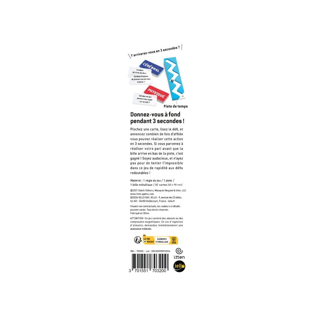 Un jeu explosif de défis à relever... en moins de 3 secondes (pas plus !). Enchérissez... et montrez vos talents ! 3 Secondes (pas plus !) est un jeu d’action frénétique dans lequel les joueurs doivent réaliser des défis en moins de trois secondes. Après une phase d’enchères, le joueur le plus ambitieux (ou le plus fanfaron) devra s’exécuter sous le regard attentif de ses adversaires ! Attention à ne pas être trop gourmand : vous n’avez QUE trois secondes.