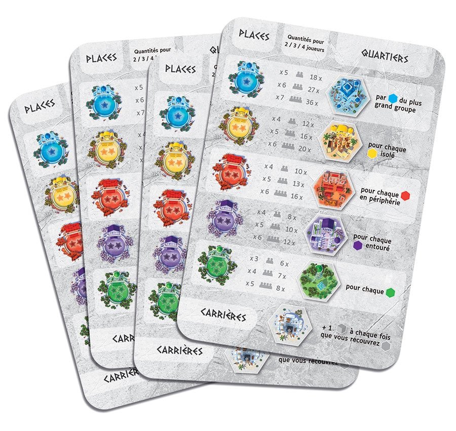 Akropolis propose un véritable défi de planification et d'ingéniosité. Les joueurs doivent non seulement gérer l'agencement optimal des tuiles mais aussi répondre aux exigences variées de différents types de quartiers. La capacité à anticiper les mouvements des adversaires et à adapter sa stratégie en conséquence est cruciale pour devenir le plus illustre des architectes de la Grèce antique.