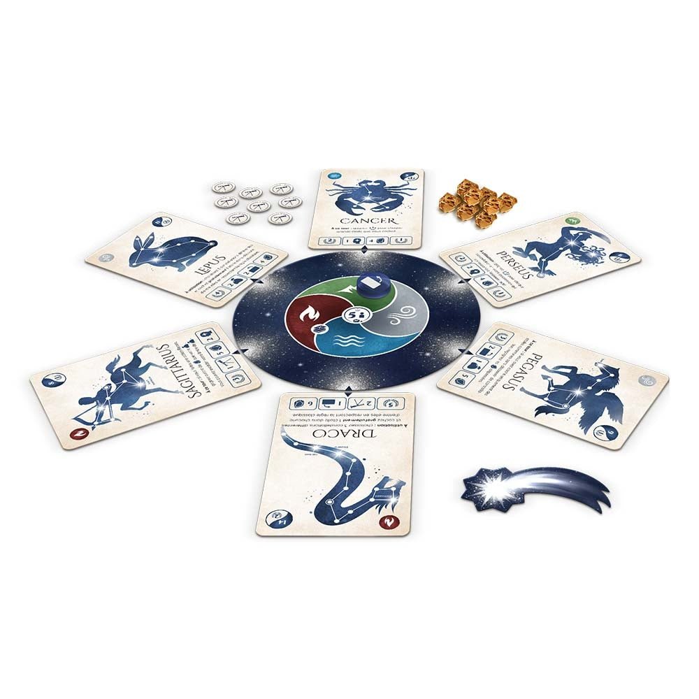 Collectez et dépensez des poussières d’étoile pour cocher de votre feutre les étoiles que vous repérez, découvrez et répertoriez des constellations, et prenez l’avantage sur vos adversaires dans l’exploration du ciel nocturne. Le joueur qui marque le plus de points de renommée sera déclaré vainqueur.