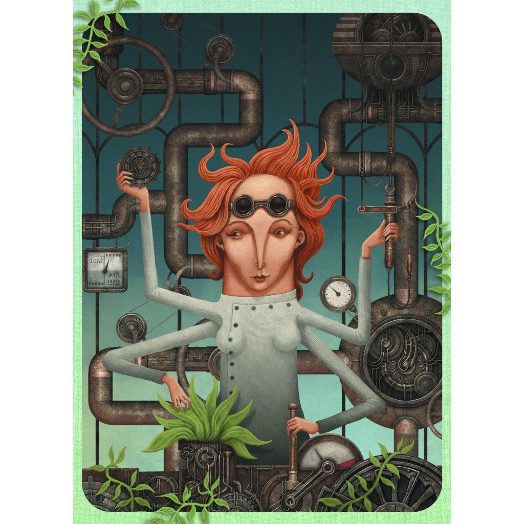 Dans un monde étrange où la vie mêle mécanique et végétation, deux scientifiques s’affrontent pour créer une formule à base de fleurs. Chaque joueur crée un réseau de distillation à l’aide de tuiles disposées dans un registre commun.