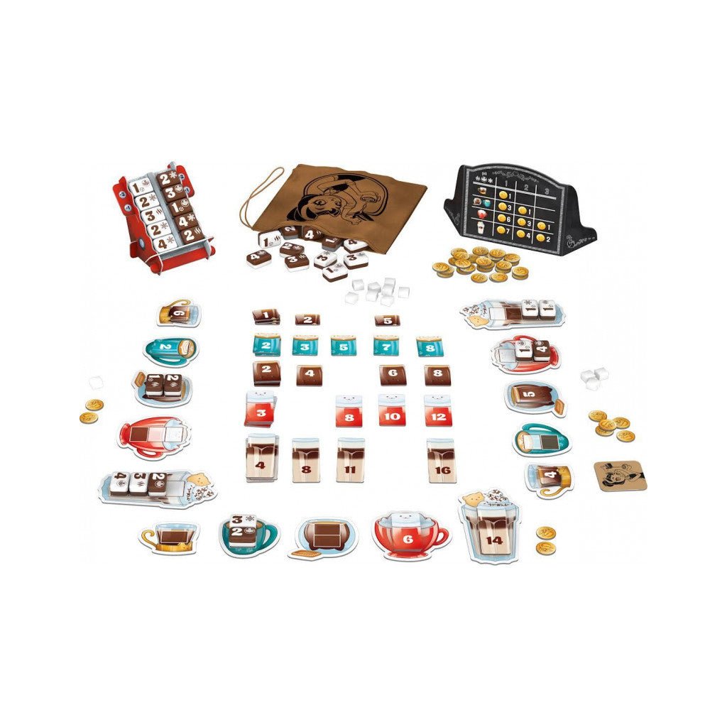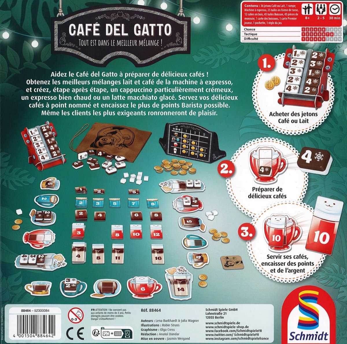 À votre tour, vous aurez le choix entre acheter une tuile café ou une tuile lait, revendre vos créations pour gagner de l'argent et des points de victoire ou passer votre tour pour gagner un peu d'argent. Cela peut paraitre simple mais il faudra surveiller en permanence l'avancée de vos adversaires. En effet, la fin de partie pourrait arriver bien plus vite que prévue. Café del Gatto est un jeu familial avec un système d'achat original et une interaction forte.