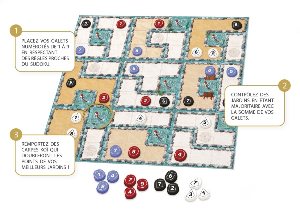 Reprenant le principe du Sudoku, les joueurs doivent placer astucieusement leurs galets numérotés afin de remporter des jardins et des carpes koï, sans qu’il n’y ait jamais deux galets de même valeur dans un même jardin, une même ligne ou une même colonne. La partie se termine lorsque les joueurs ont joué tous leurs galets. Le joueur qui a le plus de points remporte la partie.