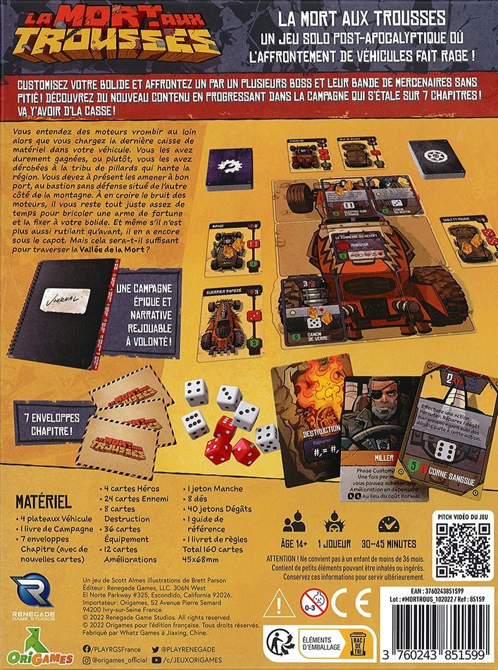 Vous entendez des moteurs vrombir au loin alors que vous chargez la dernière caisse de matériel dans votre véhicule. Vous les avez durement gagnées, ou plutôt, vous les avez dérobées à la tribu de pillards qui hante la région. Vous devez à présent les amener à bon port, au bastion sans défense situé de l’autre côté de la montagne. À en croire le bruit des moteurs, il vous reste tout juste assez de temps pour bricoler une arme de fortune et la fixer à votre bolide. Et même s’il n’est plus aussi rutilant qu’avant, il en a encore sous le capot. Mais cela sera-t-il suffisant pour traverser la Vallée de la Mort ?