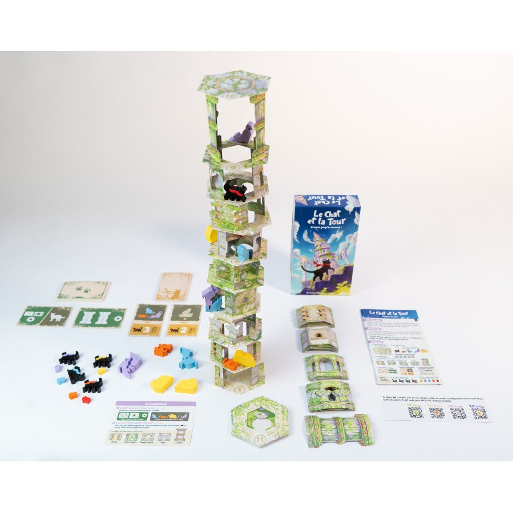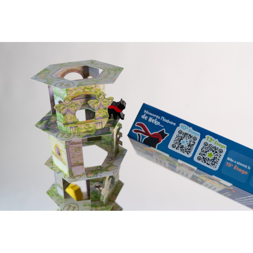 Dans Le Chat et la Tour, vous coopérez pour bâtir une tour fragile et vertigineuse grâce aux tuiles Mur et Étage, tout en accomplissant des missions pour aider Neko, le petit chat noir, à grimper toujours plus haut.