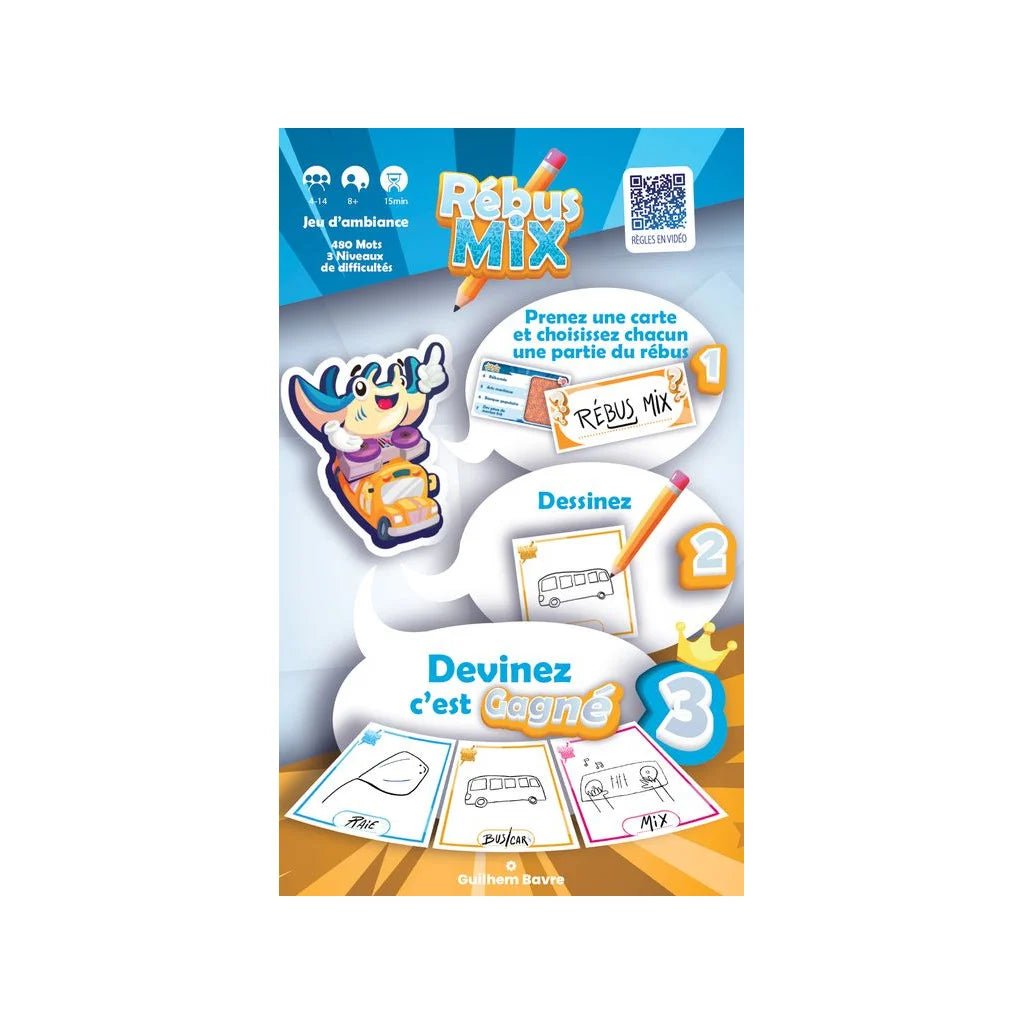 Rébus Mix est un jeu d’ambiance dynamique et amusant où les joueurs travaillent ensemble pour deviner des mots et des expressions à partir de rébus. Lors de chaque tour, un joueur est désigné comme "Rébulogue" et doit remettre dans l’ordre les dessins proposés par les autres participants. Une fois l'ordre rétabli, il doit deviner la signification du rébus. Ce jeu stimule la coopération et la créativité tout en offrant de nombreux moments de rires et de réflexion collective !